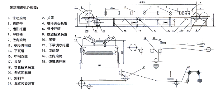 電氣保護可設(shè)有:輸送帶跑偏監(jiān)測器;輸送帶打滑監(jiān)測器;輸送帶縱向撕裂信號監(jiān)測器;料位控制監(jiān)測器等。帶式輸送機外形圖
